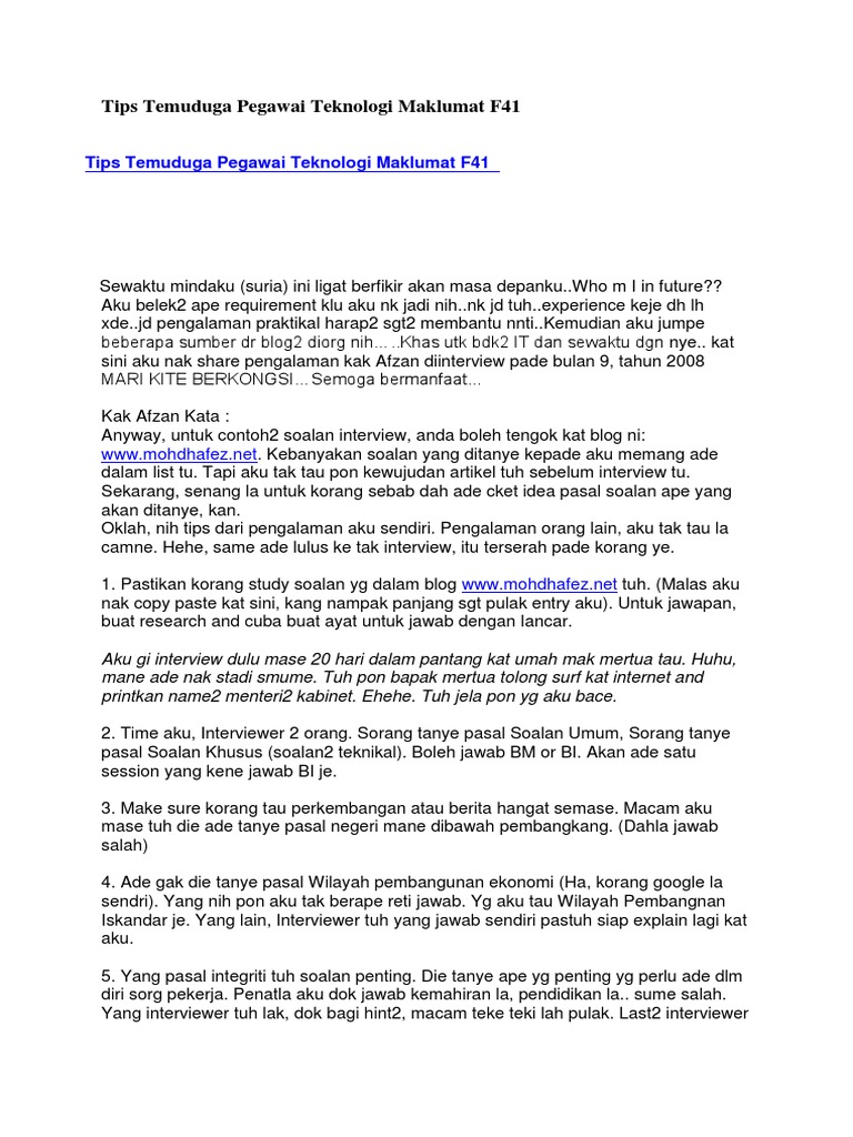 Bertanggungjawab mengkaji dan menganalisis kemungkinan kesesuaian sistem komputer yang sedia ada dan seterusnya mereka bentuk, membangun, melaksana, menyelenggara serta kajian semula sistem pemprosesan data dan. Tahniah buat semua calon yang lulus exam f41 tempoh hari. Bangunan c7, putrajaya jam : Daftar percuma nama, emel dan no. Pengetahuan am peperiksaan pegawai teknologi maklumat f41. Nota, contoh soalan & tip lulus exam juruaudit w41. Kalau tak prepare lagi memang susah untuk anda lulus peperiksaan bertulis pegawai teknologi maklumat gred f41 nanti. Temuduga spa untuk jawatan pegawai teknologi maklumat f41. Skim perkhidmatan pegawai teknologi maklumat. Sebaiknya datang awal untuk persiapan temuduga, sekurangnya dapat mengurangkan rasa gemuruh. Dan setibanya lcw di sana jam 6.30 pagi. Savesave pegawai teknologi maklumat f41 for later. 3) pemohon diminta mengisi maklumat diri dengan lengkap dan pastikan muat naik resume anda yang terkini.