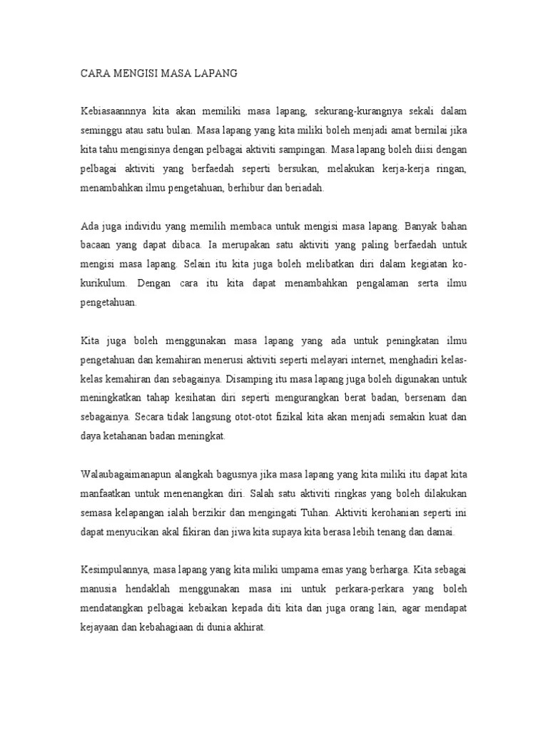 Cara Cara Mengisi Masa Lapang from imgv2-1-f.scribdassets.com Aktiviti masa lapang di belakang rumah @bahagian pertama 01. Karangan bunga banyak terpajang di balai kota untuk ahok bukanlah hal baru. Dalam konteks ini, aktiviti rekreasi berupaya kita melaksanakan aktiviti harian secara efektif kerana badan cergas, otak cerdas. Masa belajar dan masa lapang atau masa bersosial mereka dengan baik. Dengan melancong juga kita dapat mengisi masa lapang dengan perkara yang berfaedah. Memang tidak dapat dinafikan bahawa,kegiatan kokurikulum sememangnya mendatangkan pelbagai faedah kepada pelajar.aktiviti kokurikulum dapat menyihatkan tubuh badan pelajar.aktiviti kokurikulum seperti 1m1s dapat. Pelbagai aktiviti berfaedah yang boleh dilakukan oleh golongan remaja untuk mengisi masa lapang antaranya ialah dengan beriadah.dengan beriadah selain itu,remaja perlu melibatkan diri dengan pelbagai aktiviti kemasyarakatan yang sering kali dianjurkan oleh pelbagai pihak terutamanya pihak. Contoh karangan cara menghargai masa.berikut dikongsikan contoh karangan bahasa melayu (bm) yang bertajuk cara menghargai masa buat panduan pelajar yang bakal menghadapi peperiksaan awam tahun 2016 nanti.